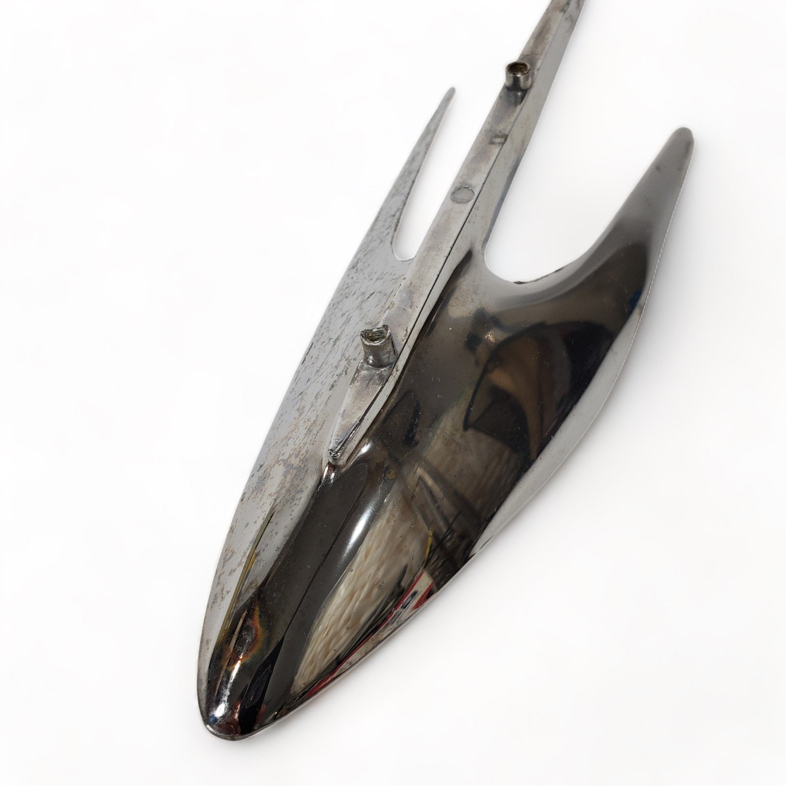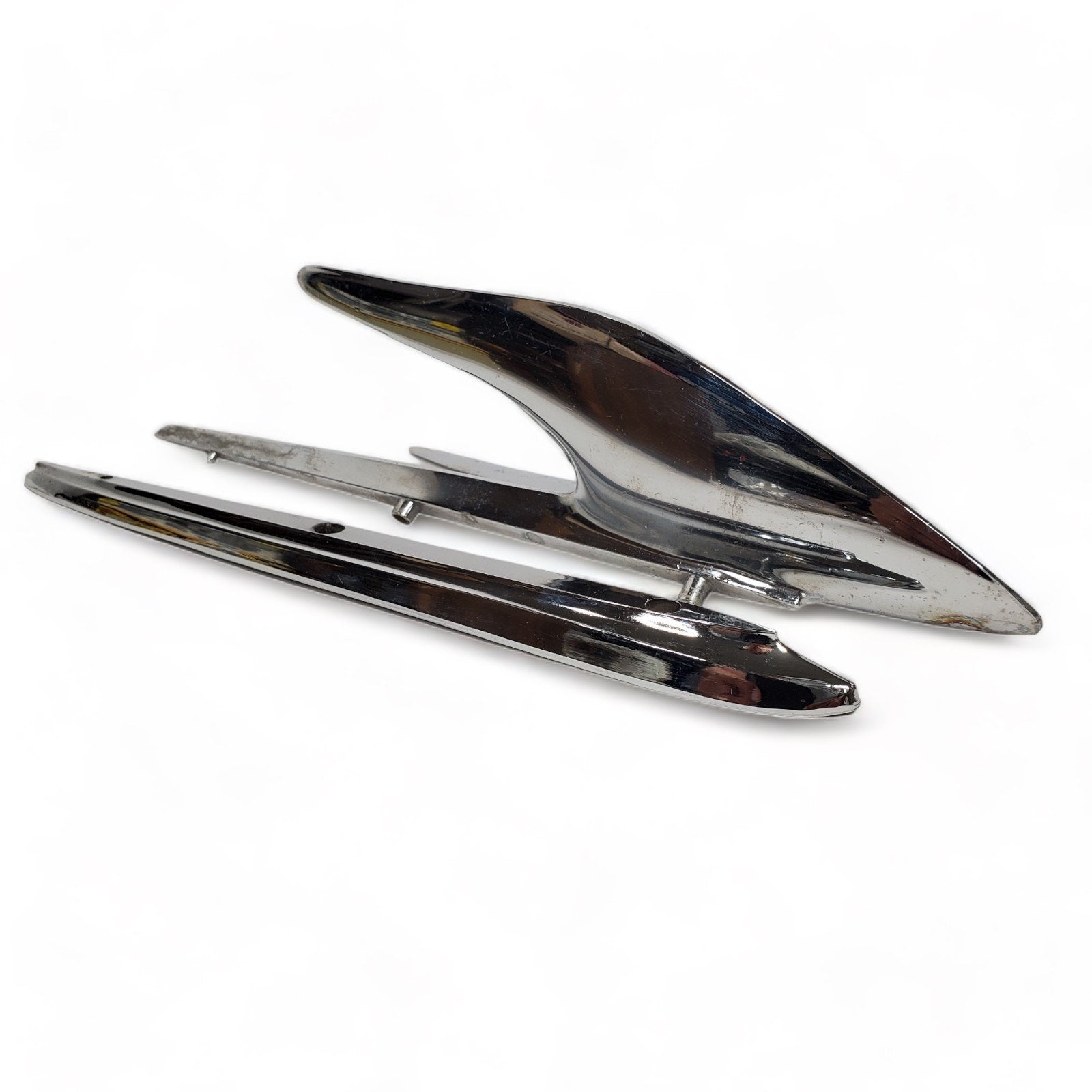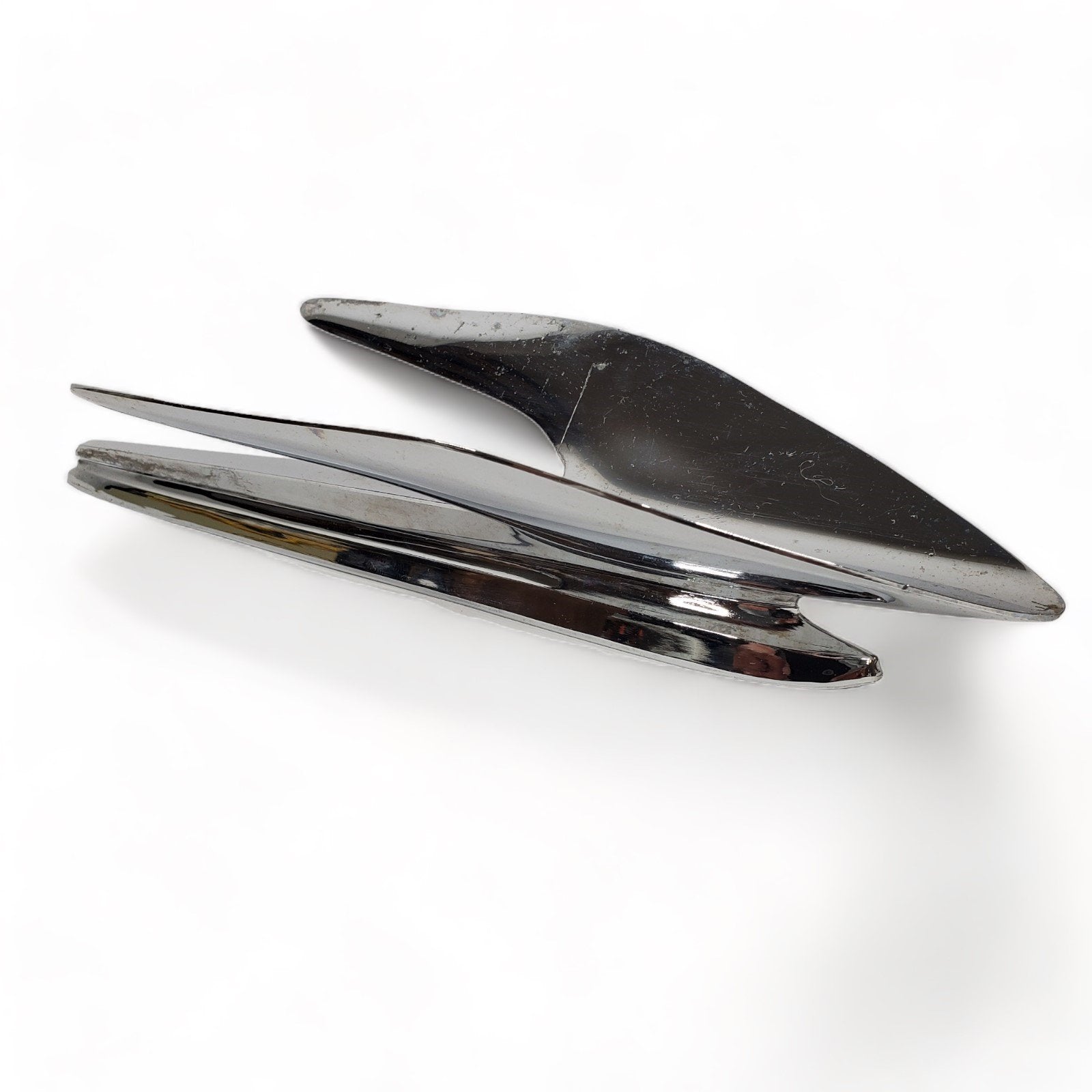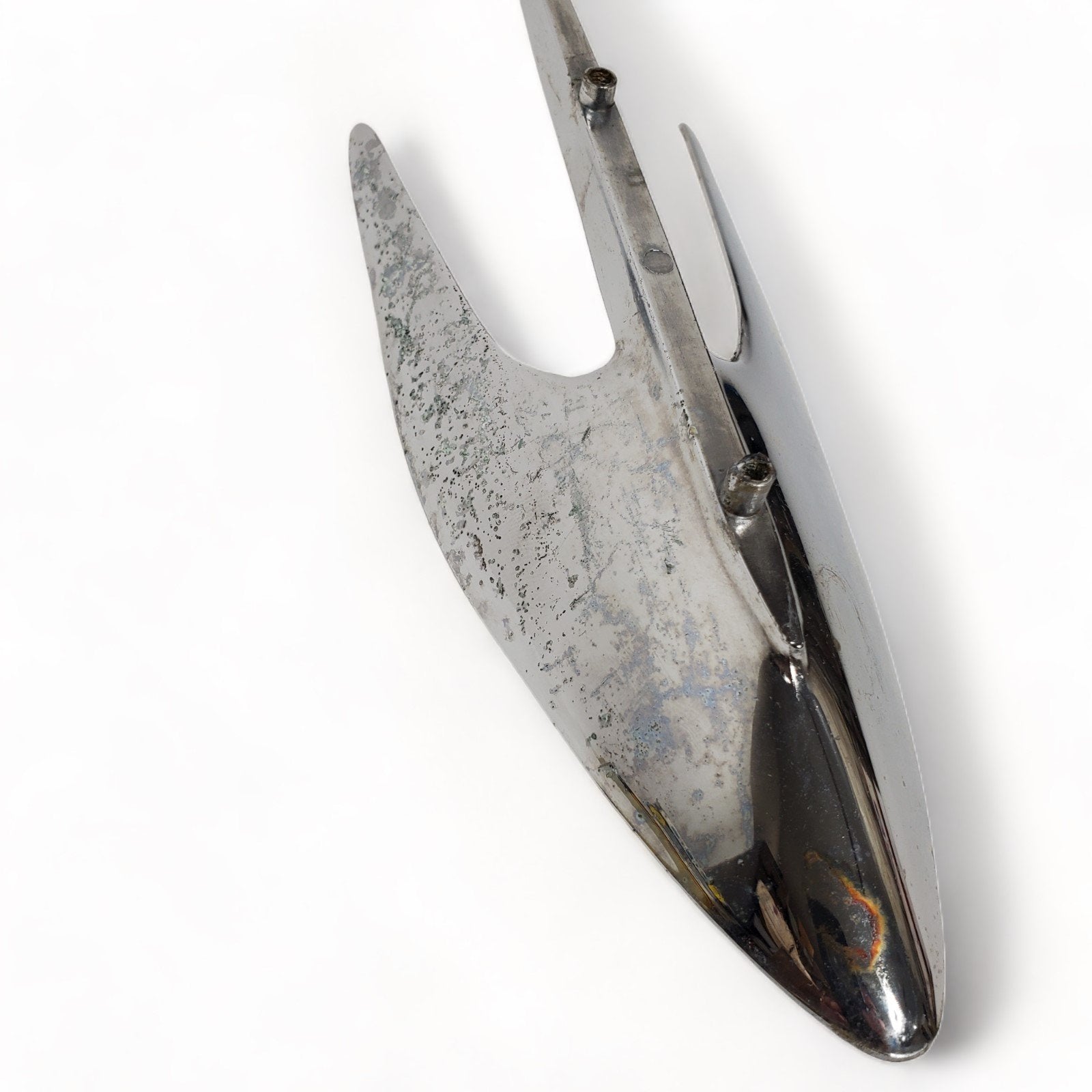 NOS but was exposed to moisture so chrome has some pitting. Also some scuffs and scratches from previous use and storage. Great candidate for show car restoration. As you can see, the box was severely deteriorated, so we discarded it, but retained the box flap with the part number.