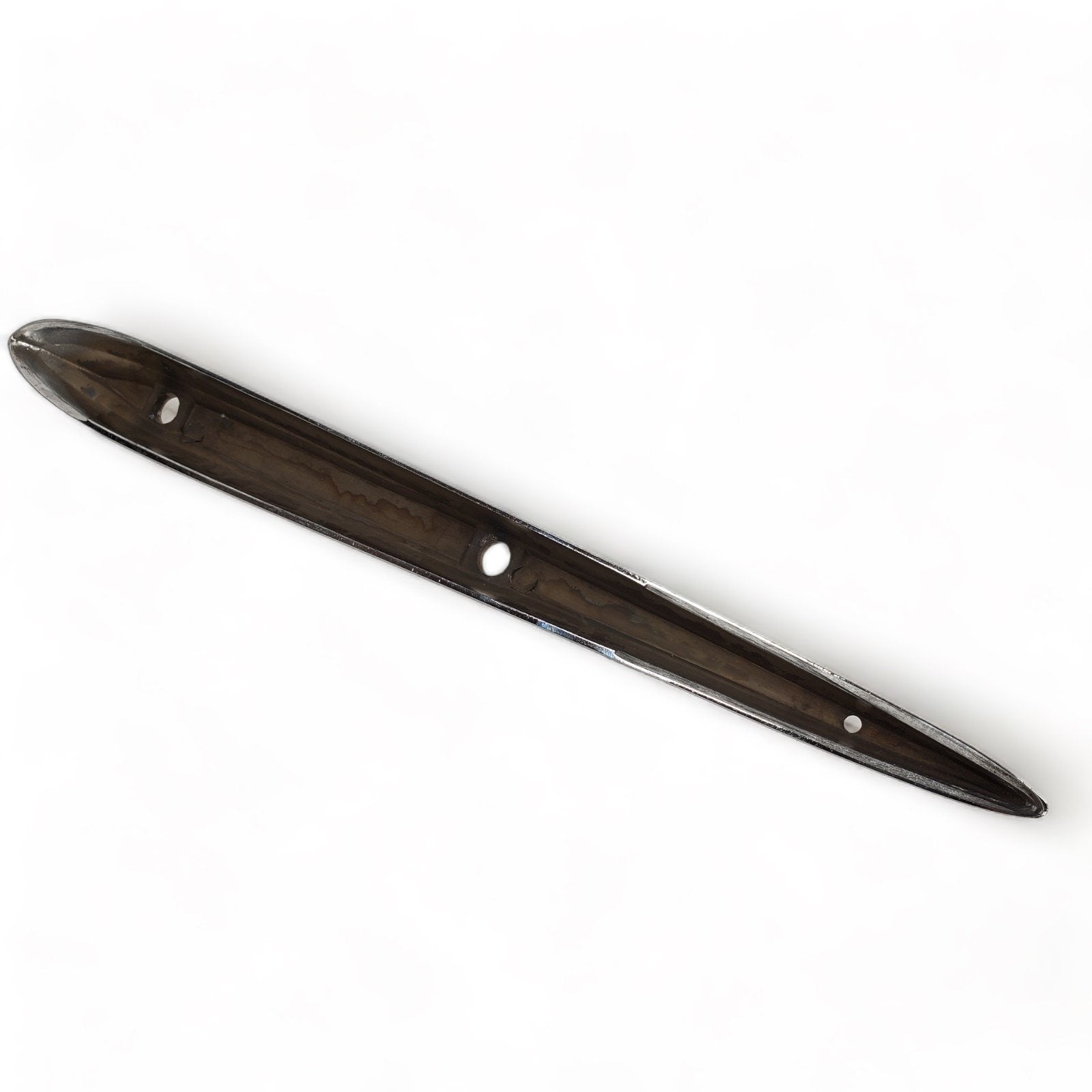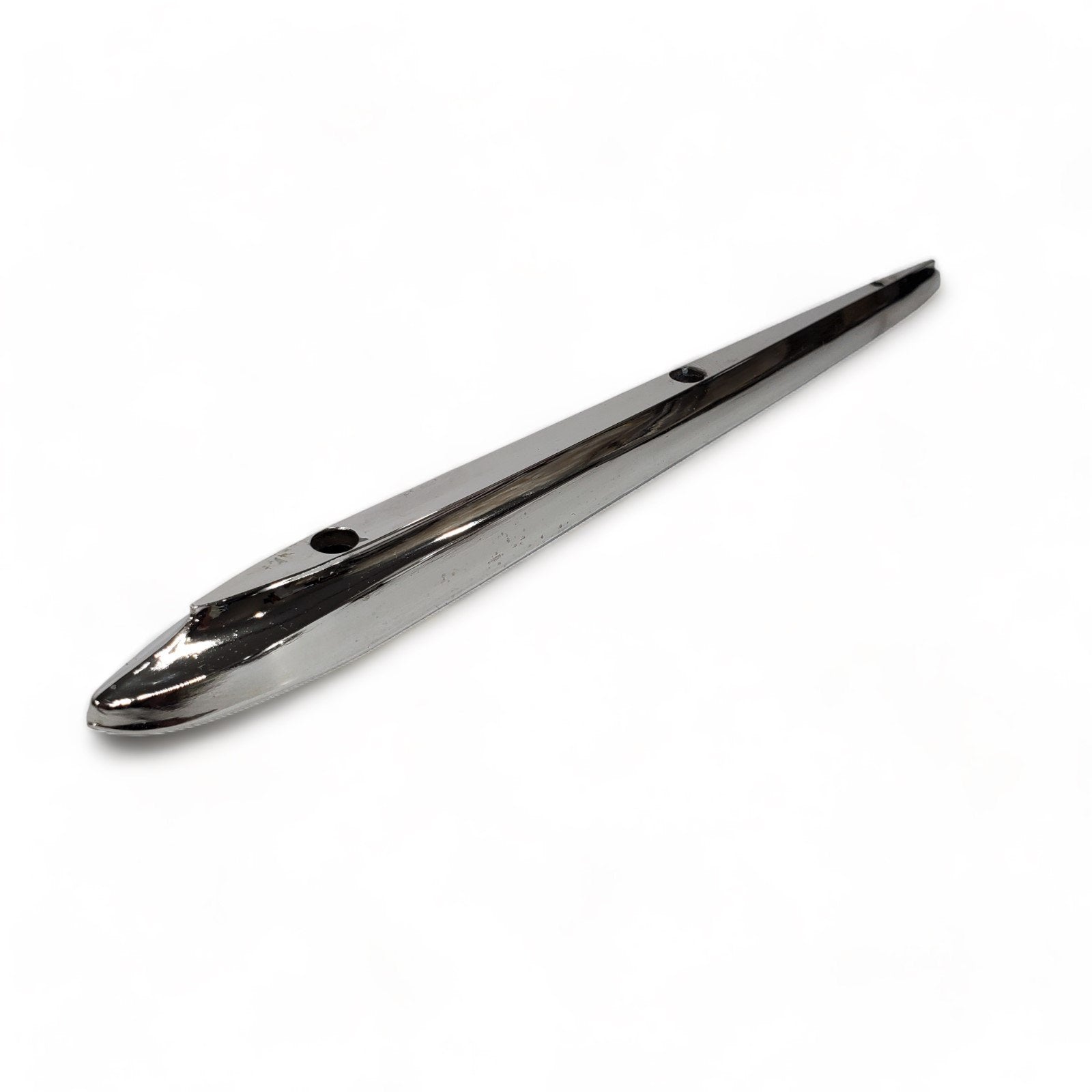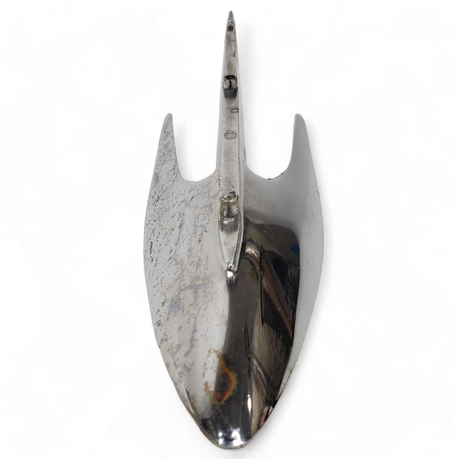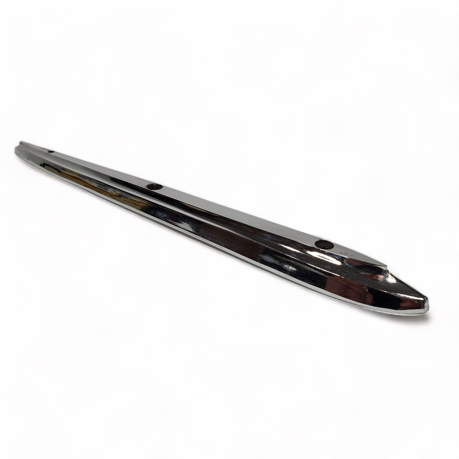 NOS but was exposed to moisture so chrome has some pitting. Also some scuffs and scratches from previous use and storage. Great candidate for show car restoration. As you can see, the box was severely deteriorated, so we discarded it, but retained the box flap with the part number.