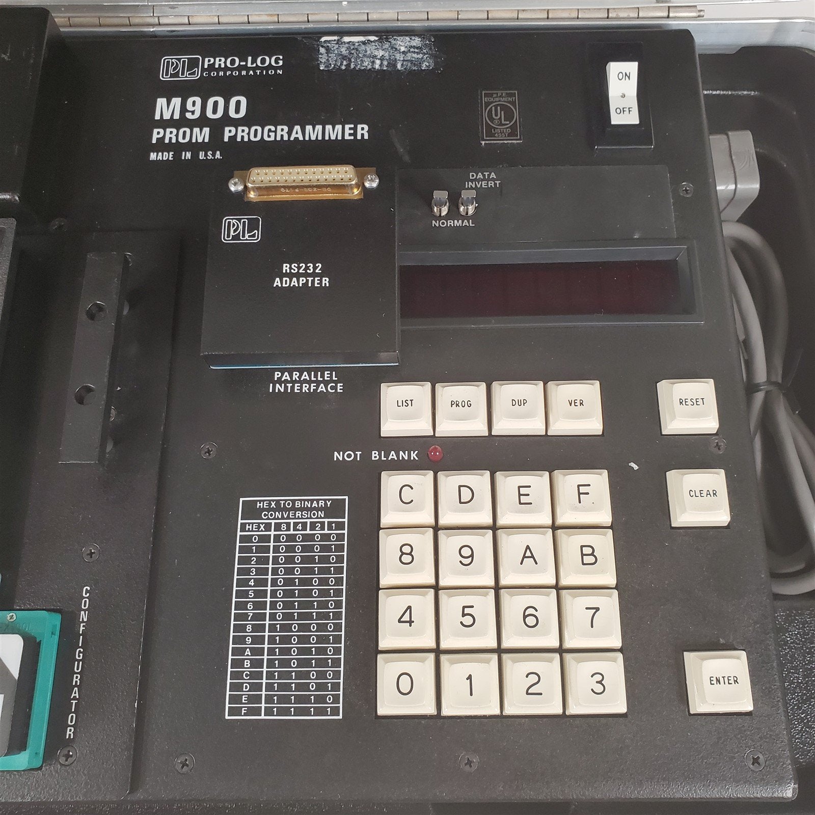 Unit includes a rare PM9074 Intel HMOS Personality Module, PA24-10 Pinout Adapter, Configuration EEPROM, RS232 Interface Adapter, Original Power Cord, Manual and pamphlets.