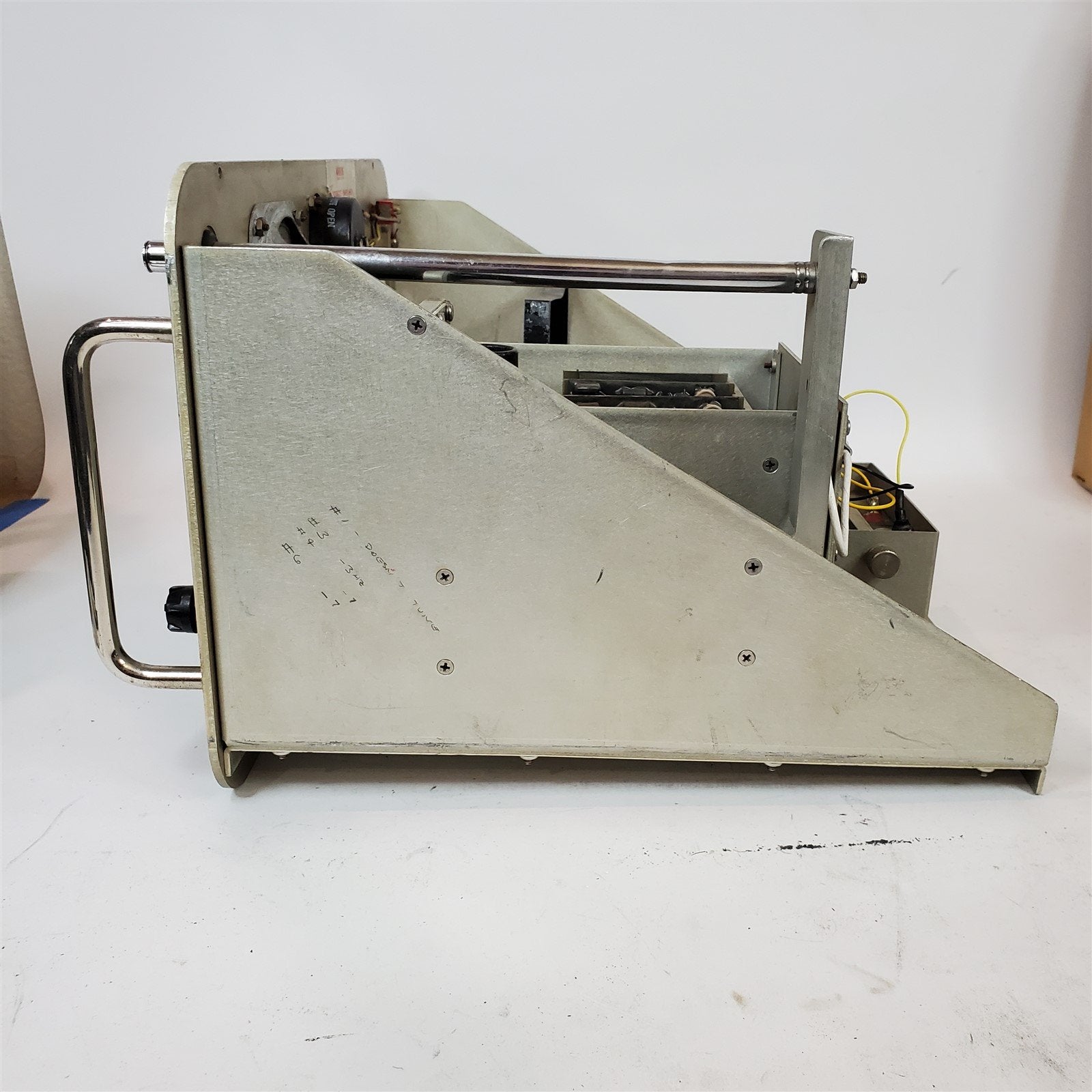 Used condition with scuffs and scratches from previous use. Powers up and seems to tune to the different frequencies. The empty slot appears to be for a scope or something similar.