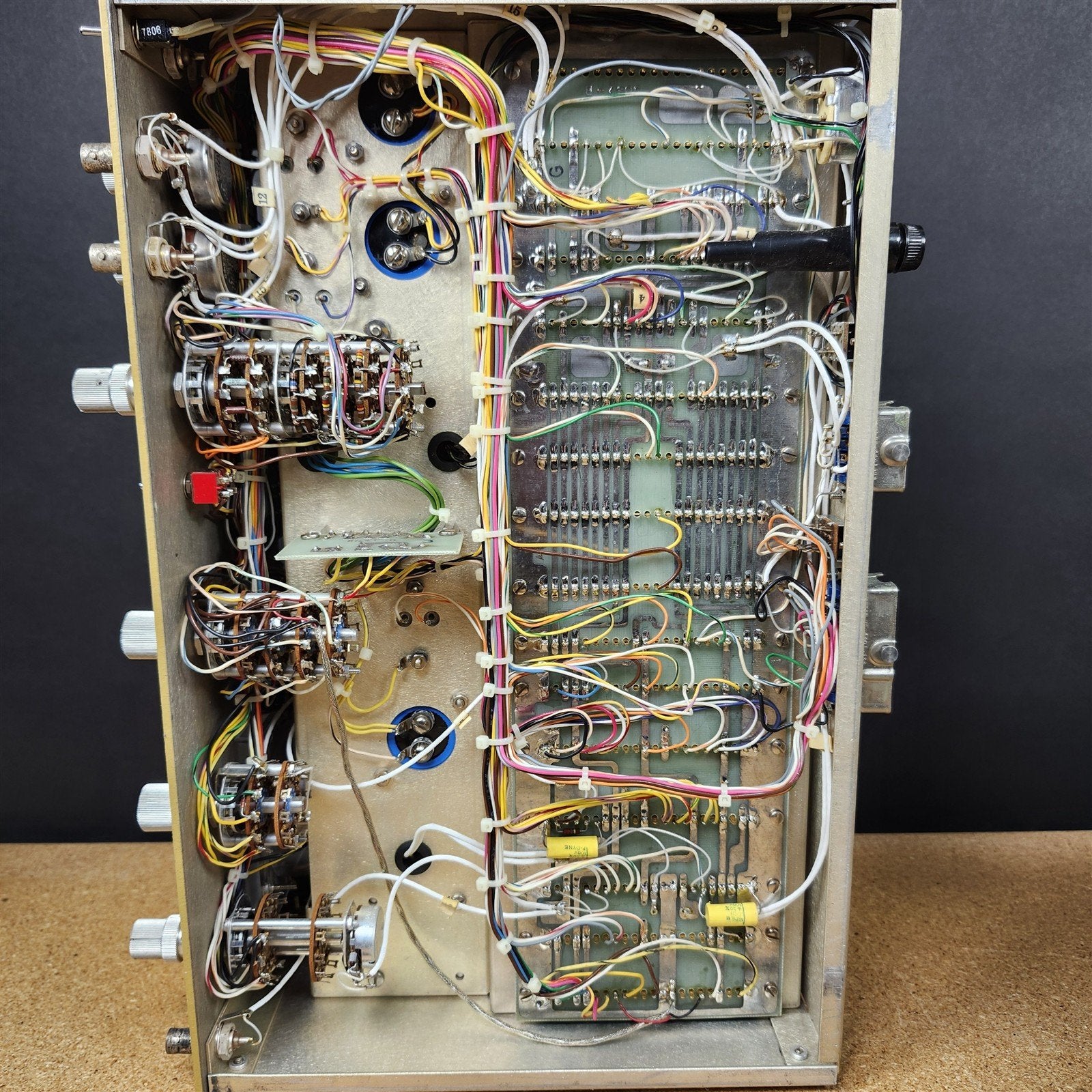 Previously used condition with scuffs, scratches and some grime - could be cleaned better. RMS Meter needle moves freely. Powers on and stabilizes on a frequency. Frequency adjustment work as they should.